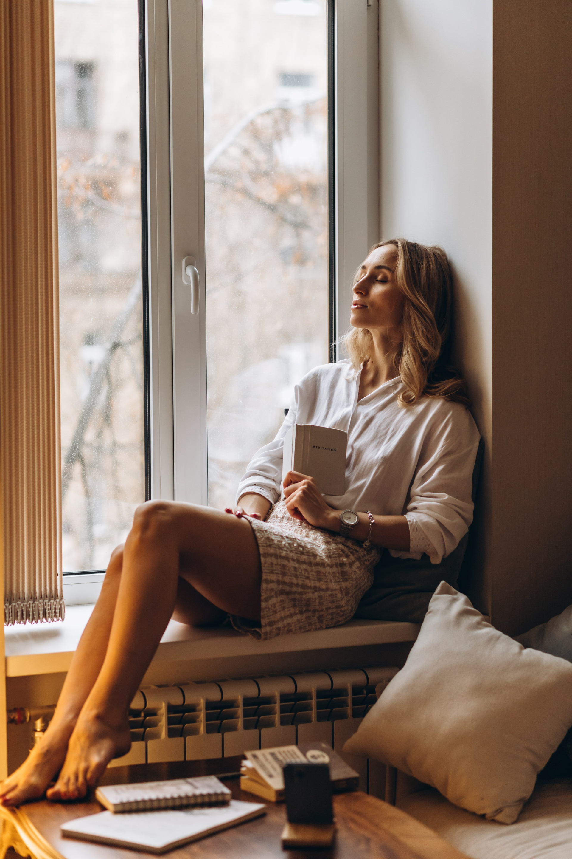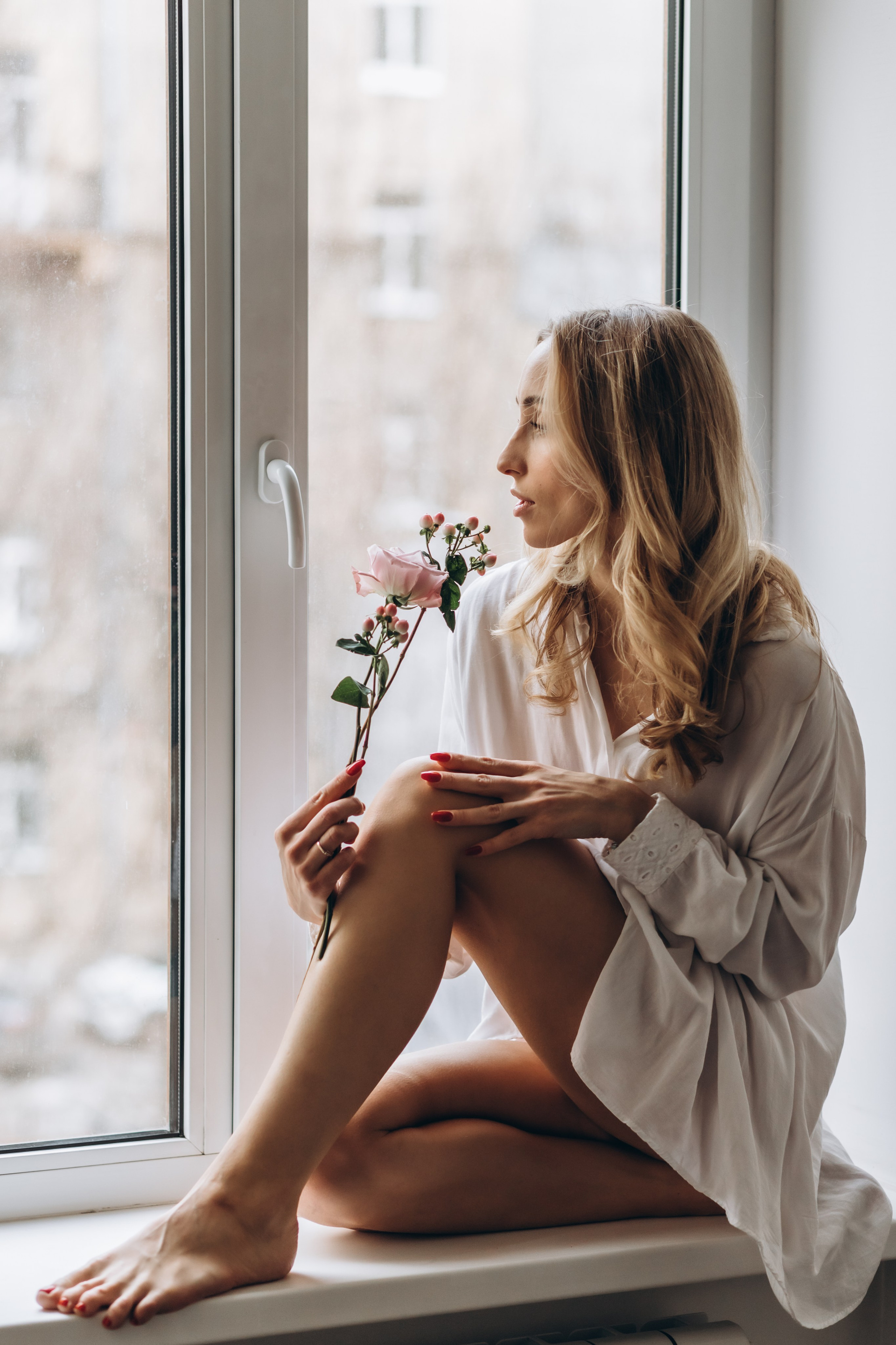 девушка в белой рубашке на окне