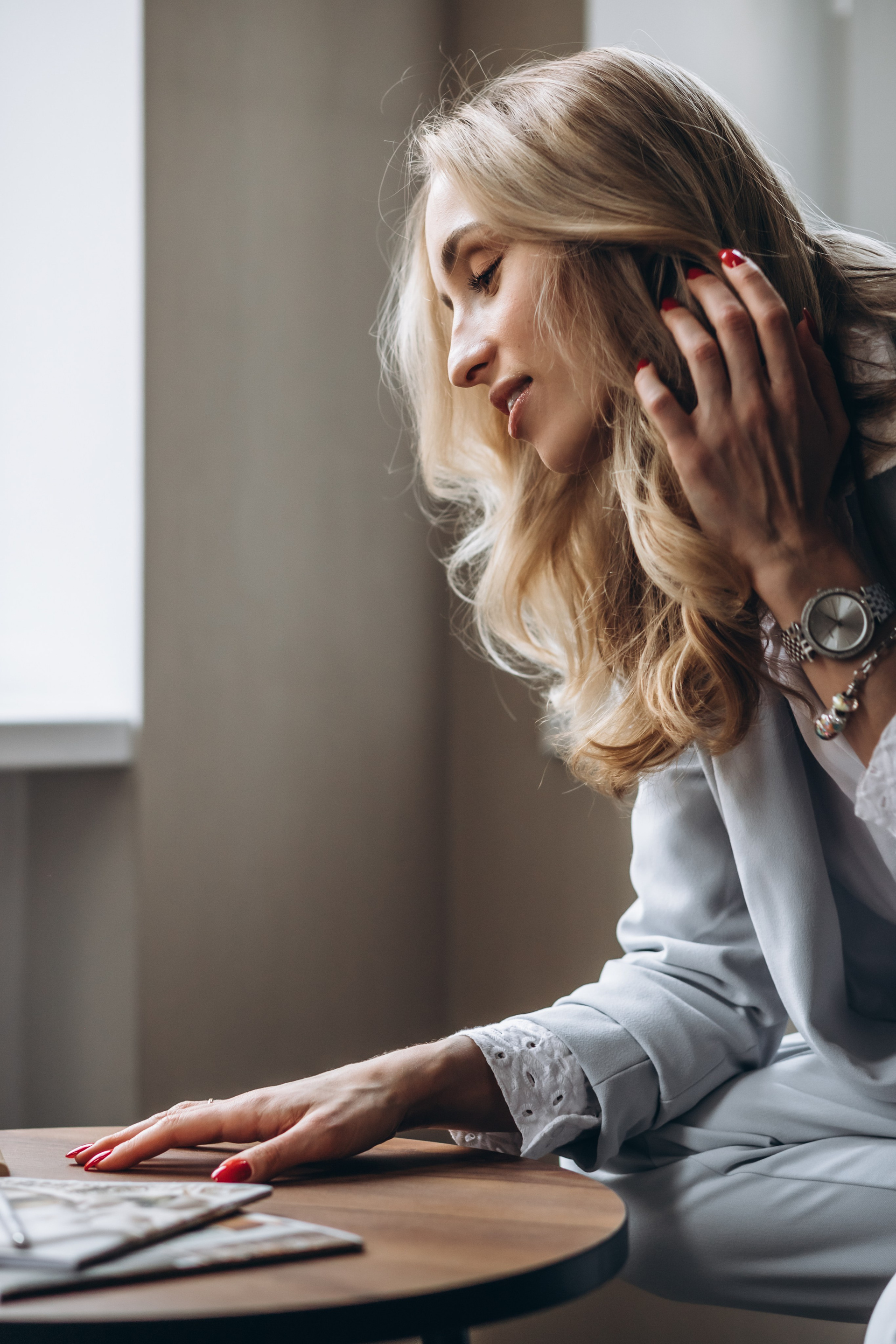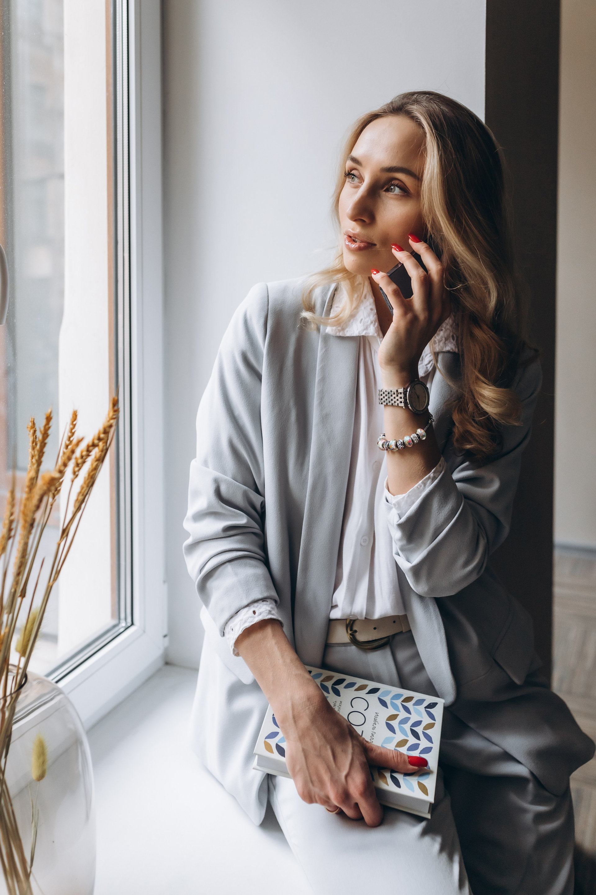 девушка в офисном костюме разговаривает по телефону на окне