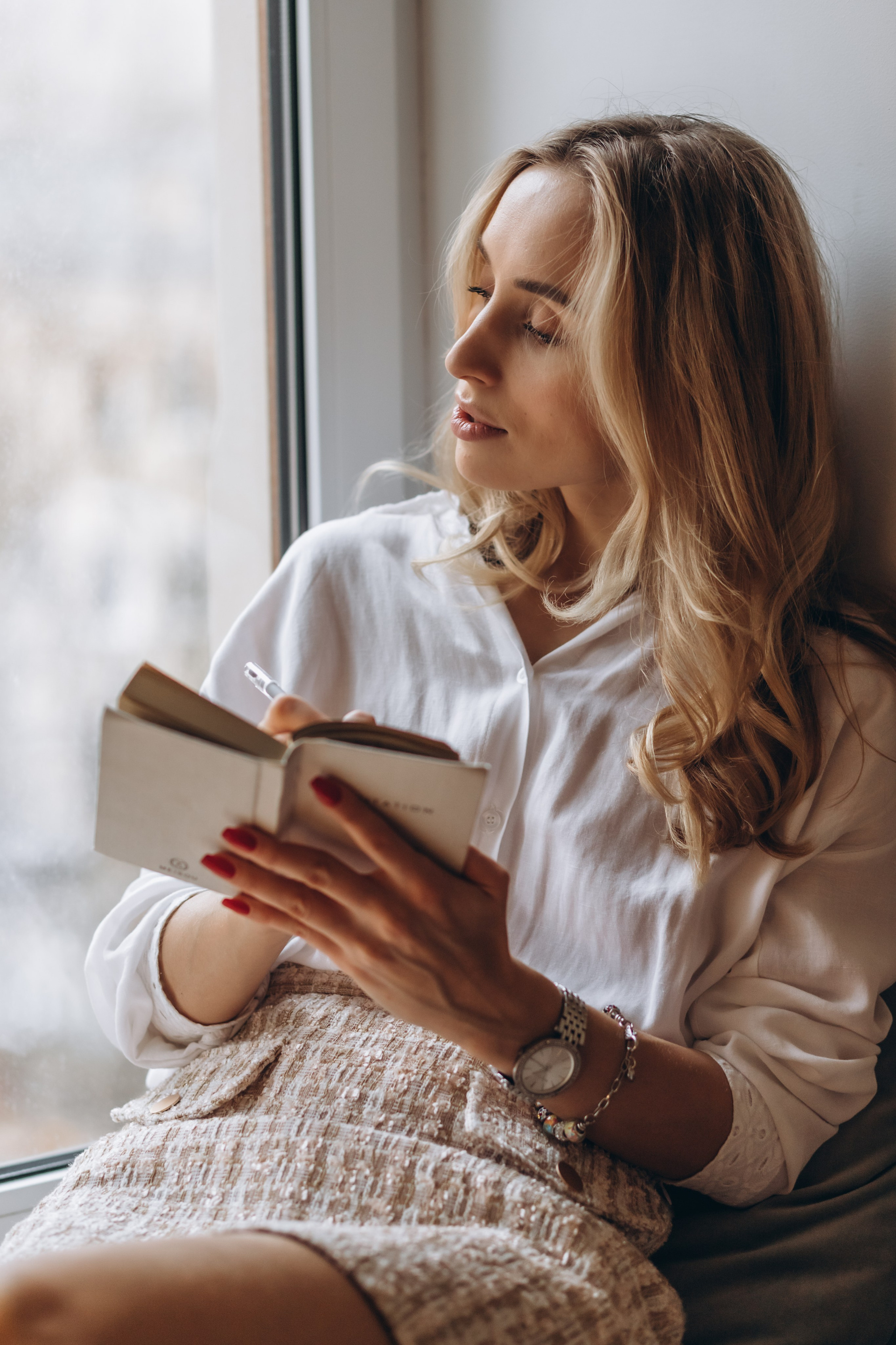 фотографии для социальных сетей девушка записывает в блокнот у окна